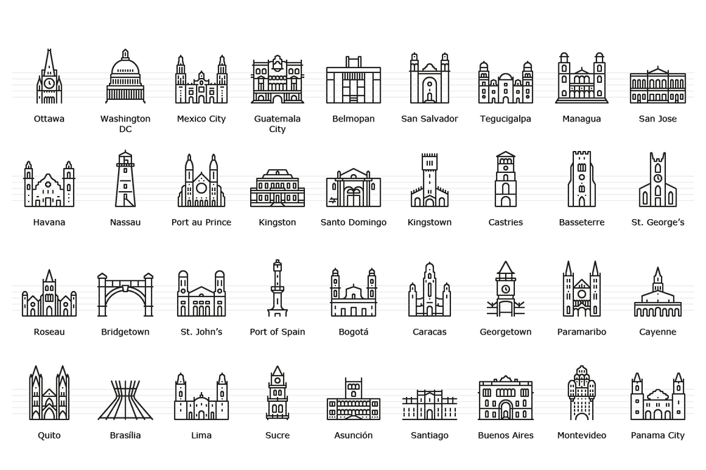 American capitals symbolized by their main landmark building.